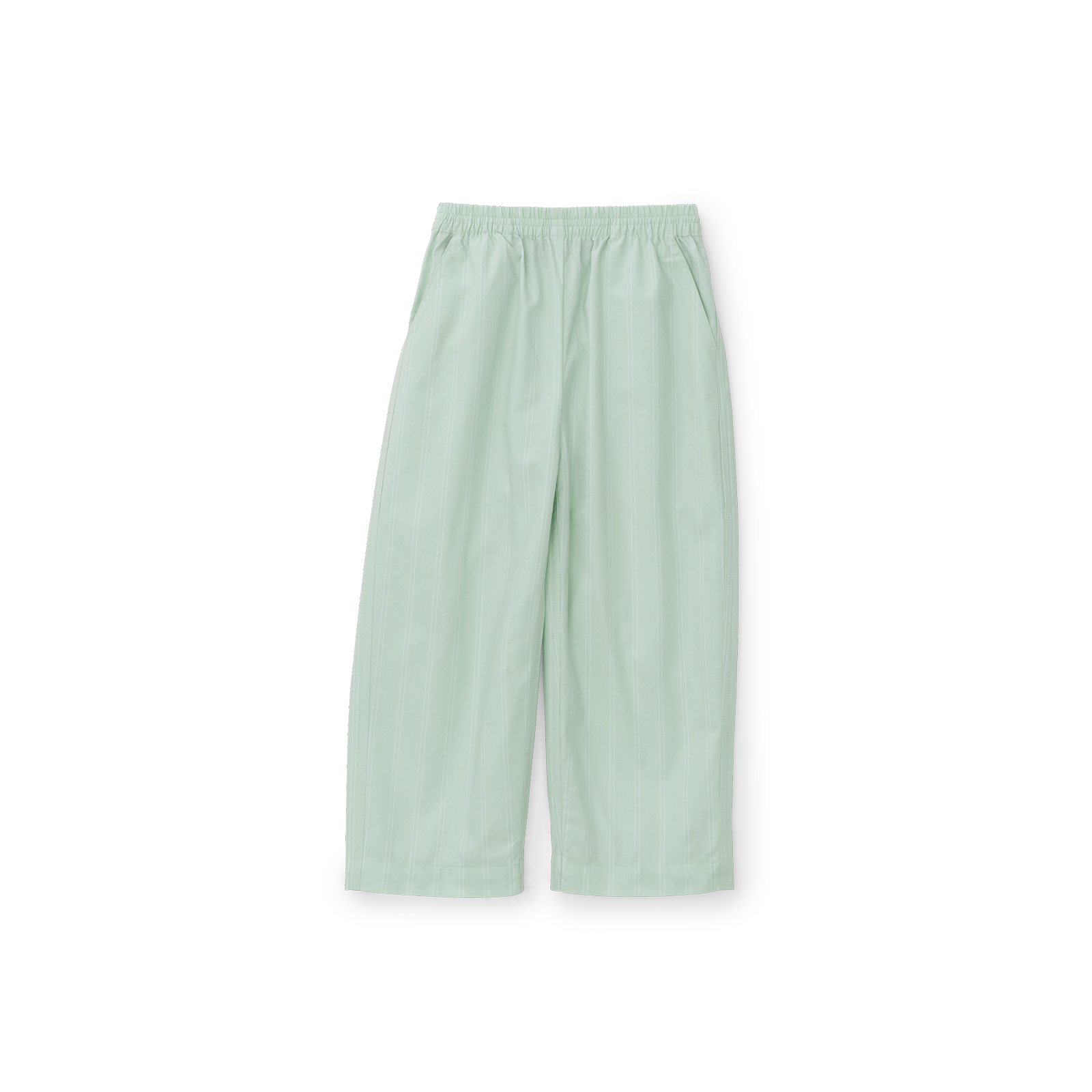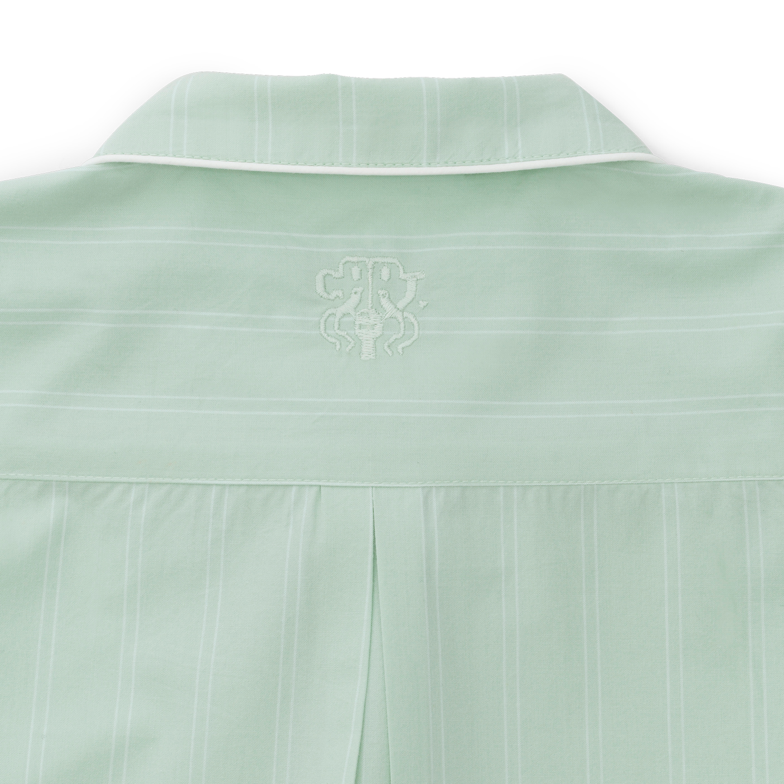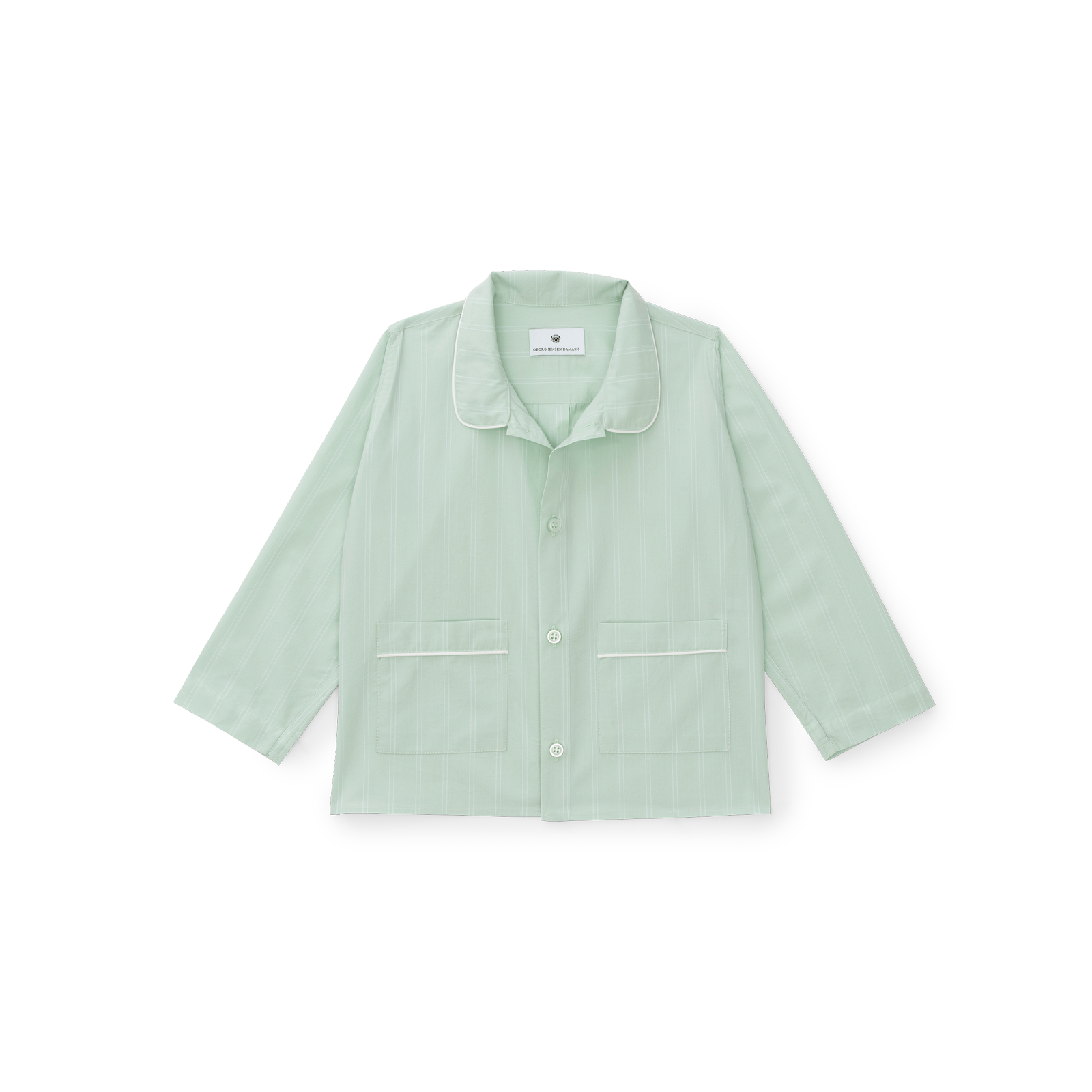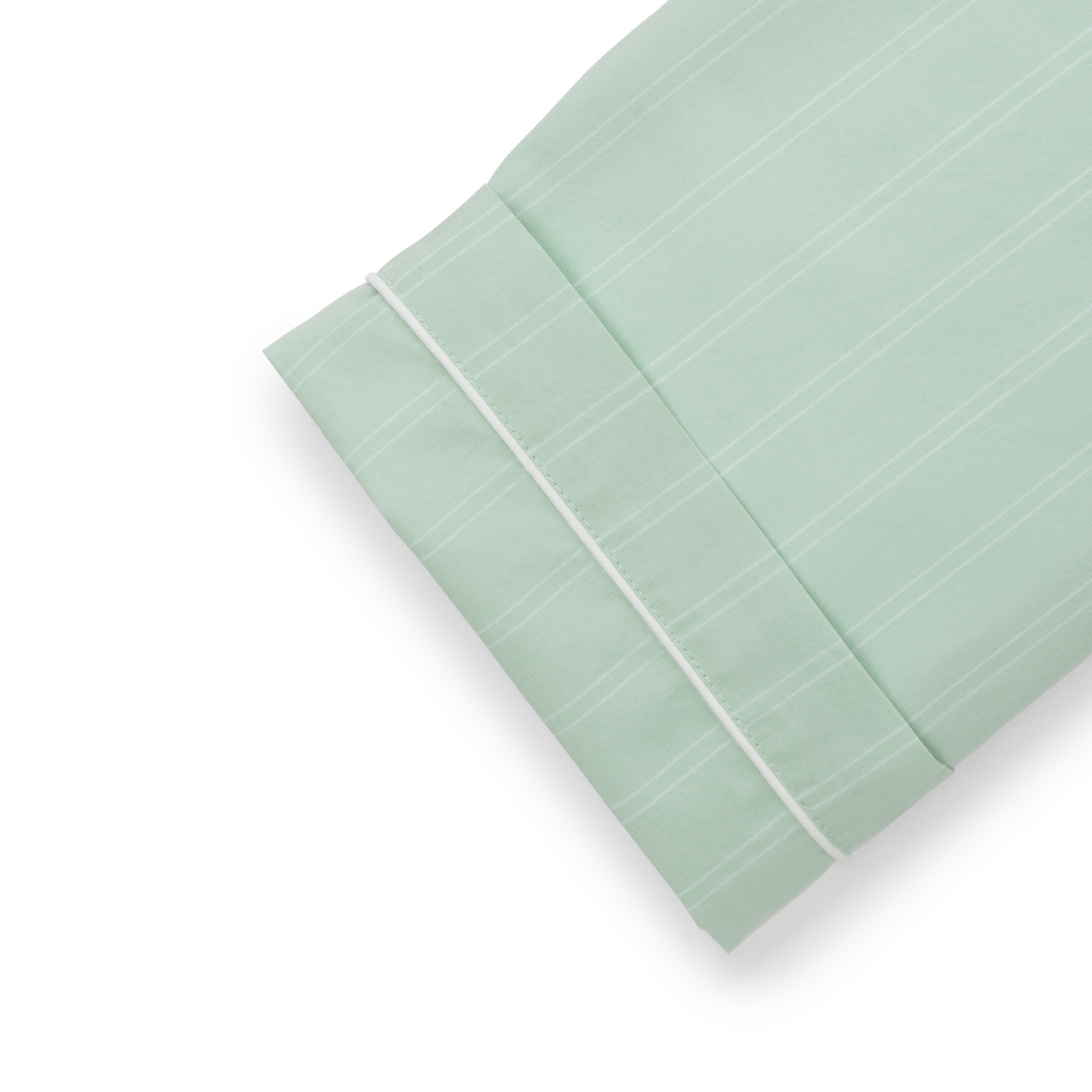 Unisex-pysjamas til barn vevd i Supima bomull percale. Pysjamasen har en klassisk passform, elegante hvite kantbånd og slanke nålestriper mot en bakgrunn i fargen Glass Green – en klar, grønnblå nyanse inspirert av fargen på råglass.
