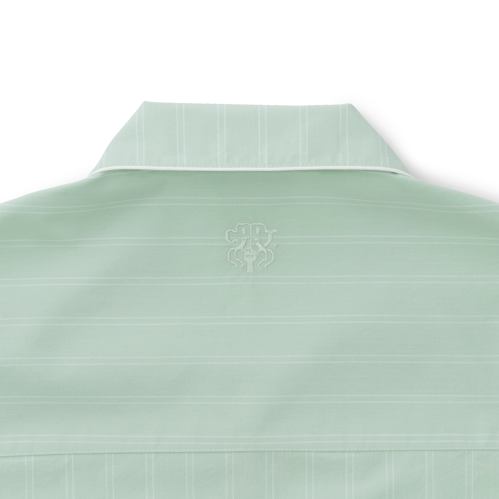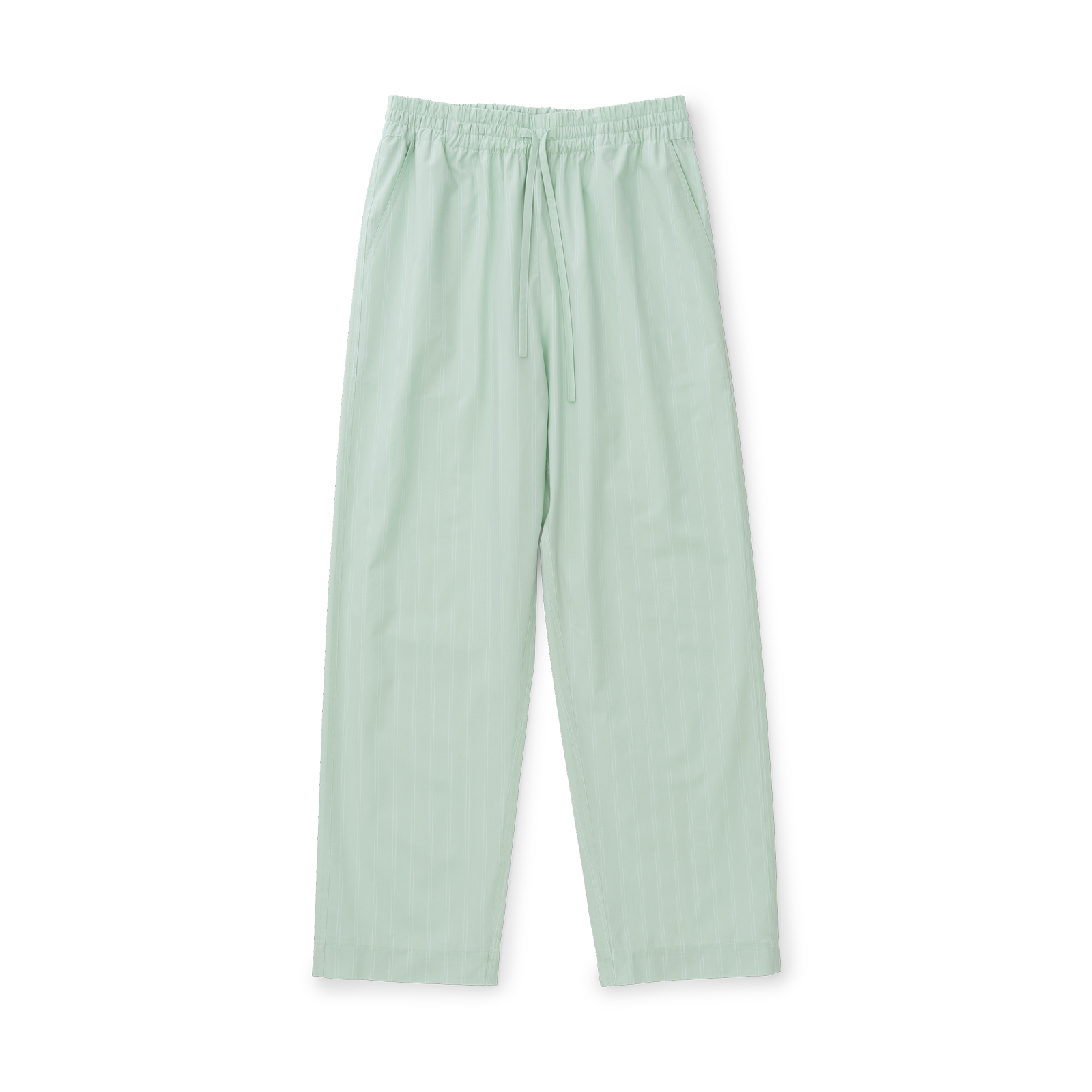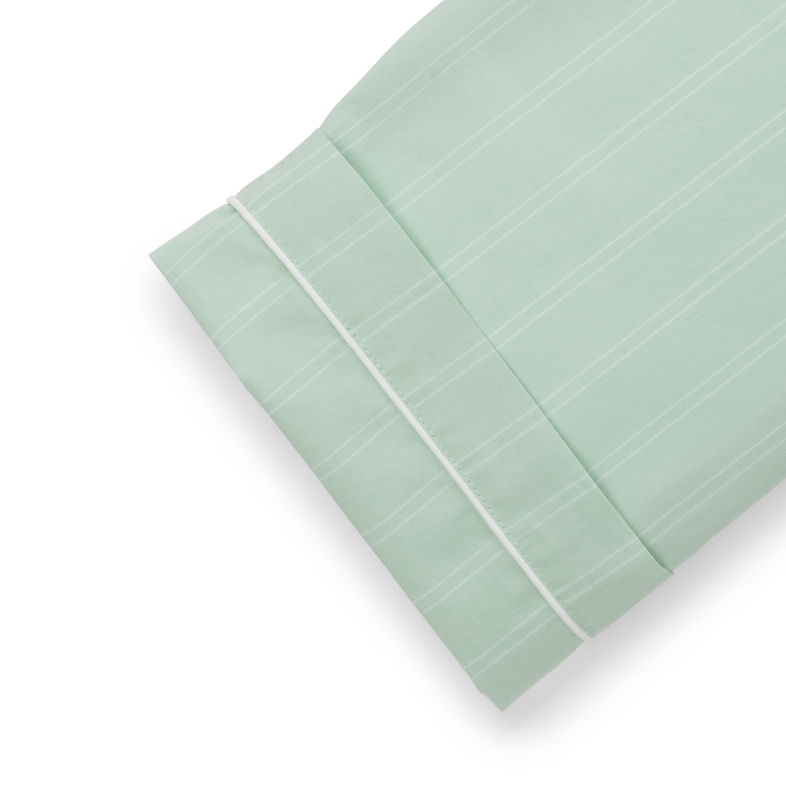 Unisex-pysjamas vevd i Supima bomull percale. Pysjamasen har en klassisk passform, elegante hvite kantbånd og slanke nålestriper mot en bakgrunn i fargen Glass Green – en klar, grønnblå nyanse inspirert av fargen råglass.