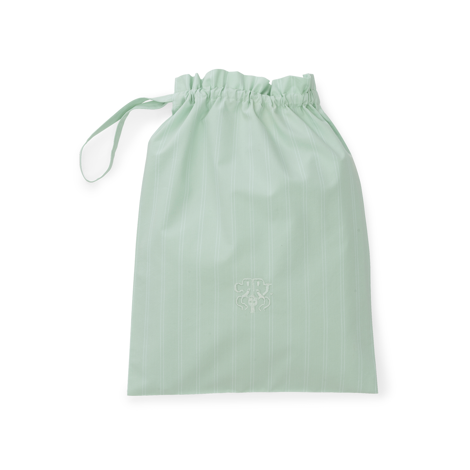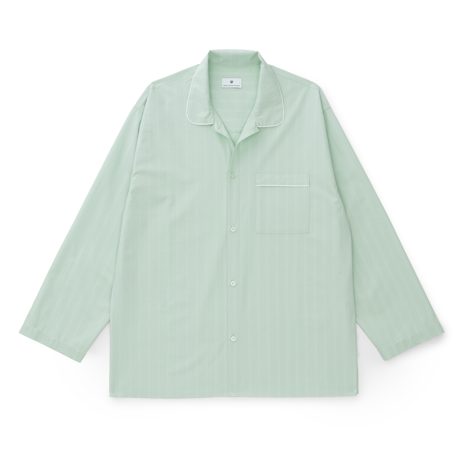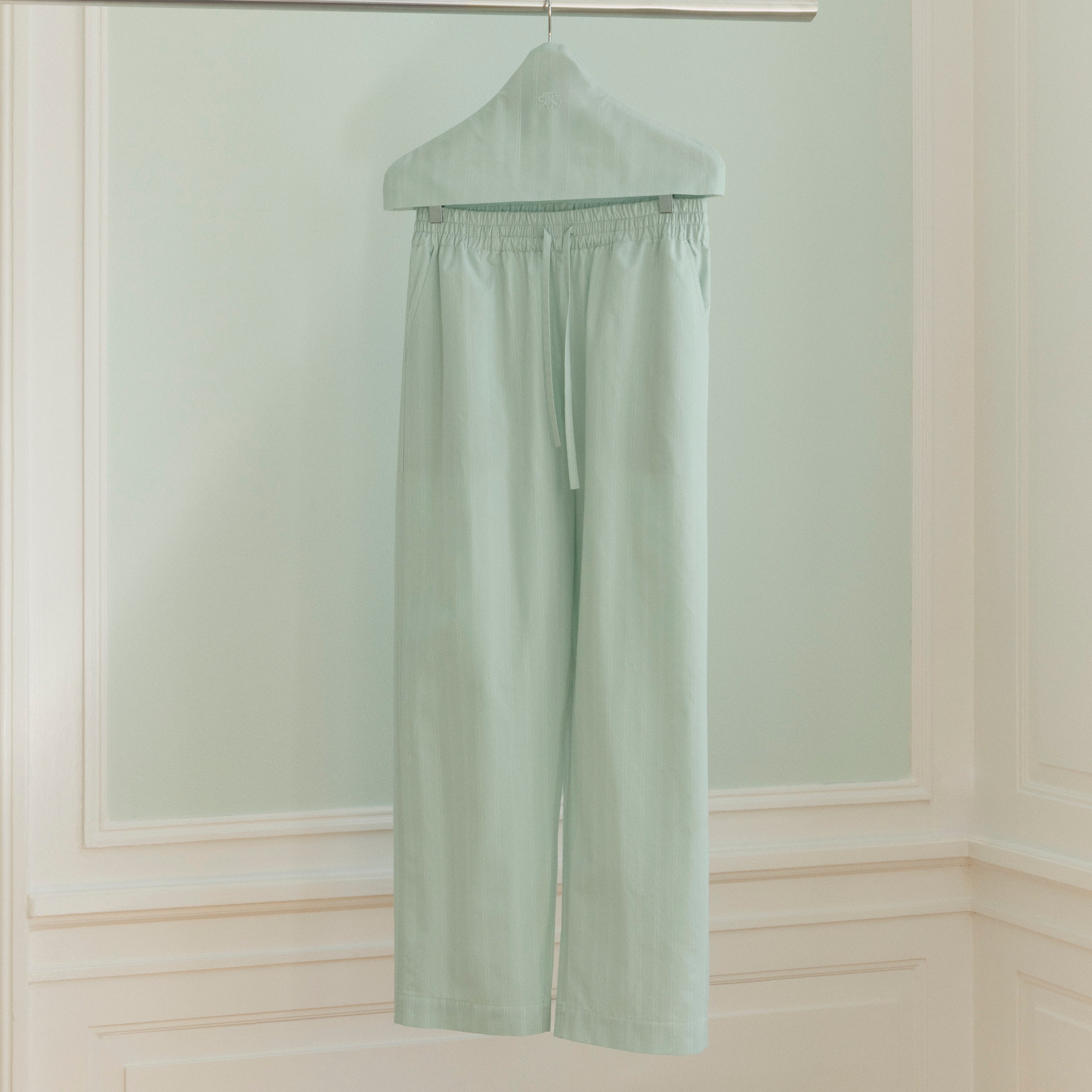 Unisex-pysjamas vevd i Supima bomull percale. Pysjamasen har en klassisk passform, elegante hvite kantbånd og slanke nålestriper mot en bakgrunn i fargen Glass Green – en klar, grønnblå nyanse inspirert av fargen råglass.
