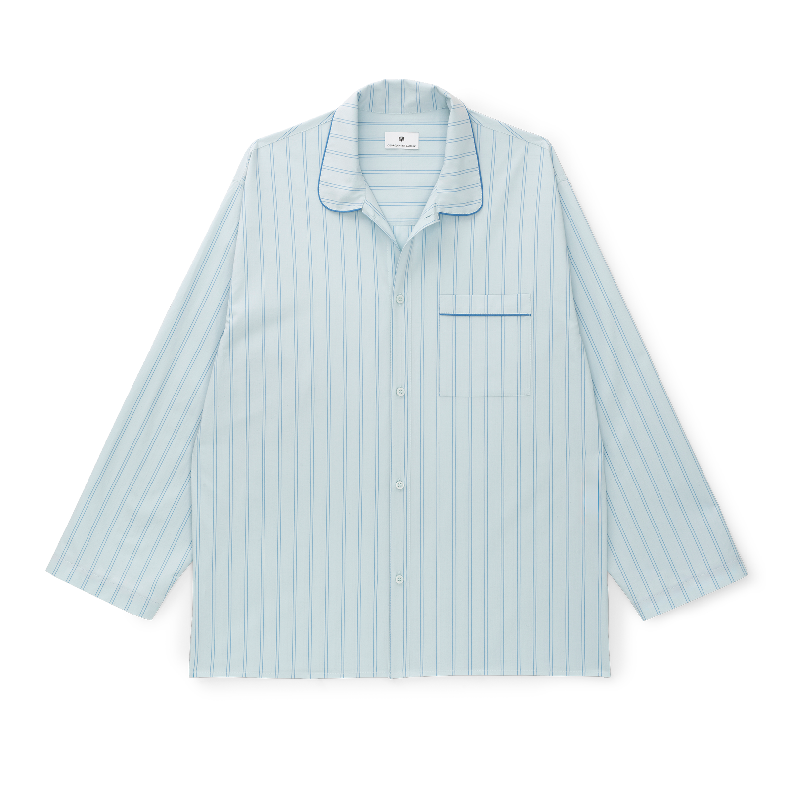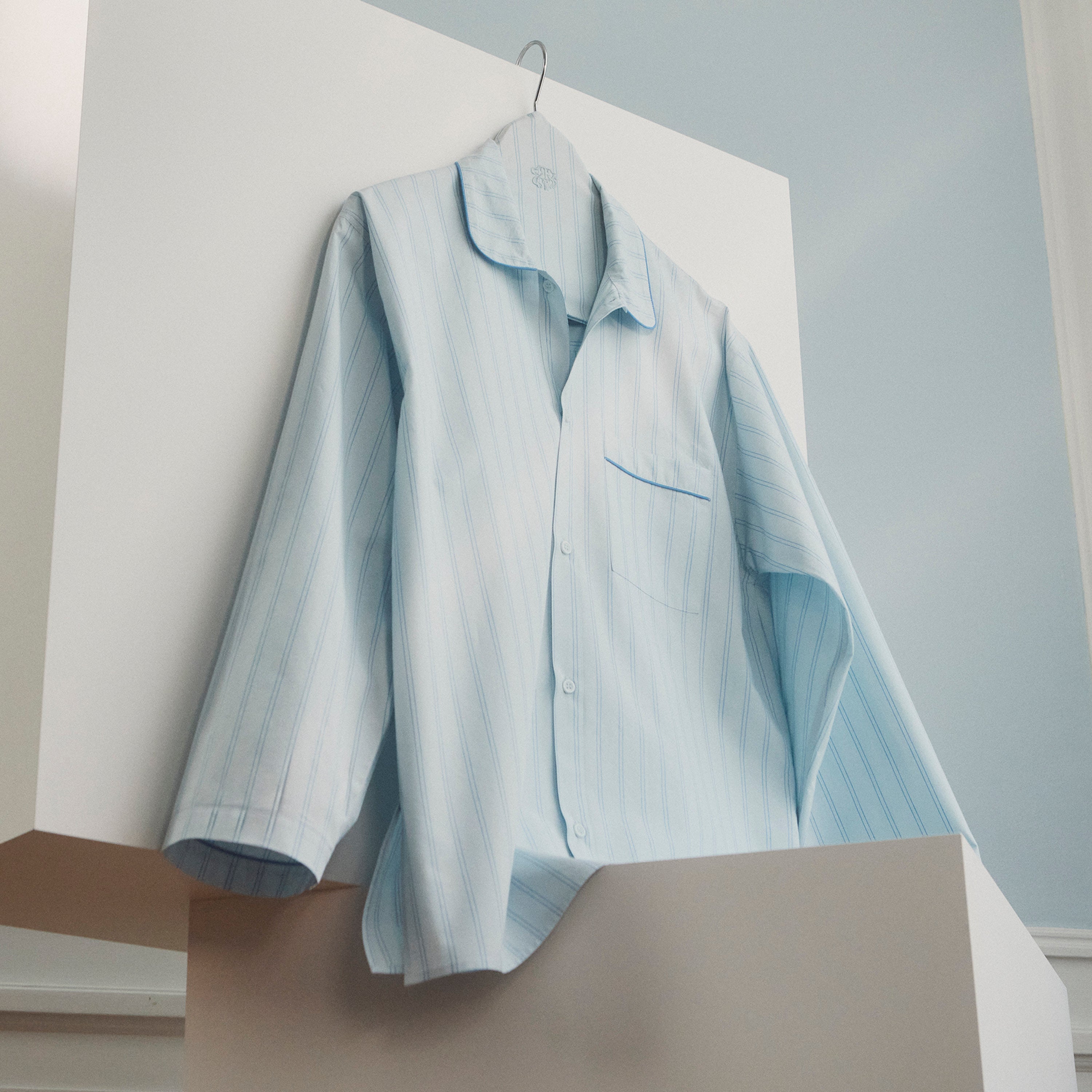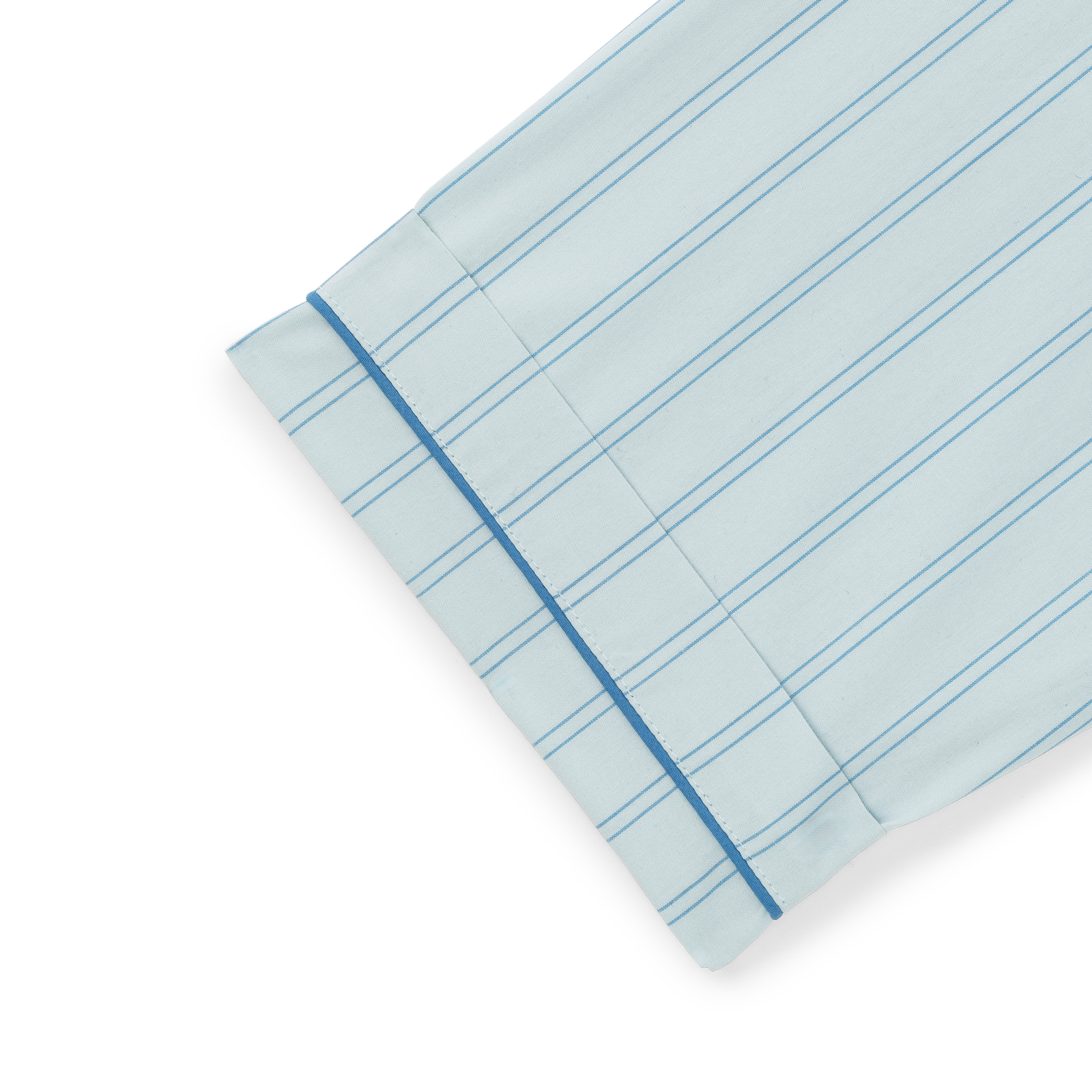 Unisex-pysjamas vevd i Supima bomull percale. Pysjamasen har en klassisk passform, elegante kantbånd og slanke nålestriper i Bright Blue mot en bakgrunn i fargen Minimal Blue – en veldig lys variant av lyseblå med et hint av aqua.