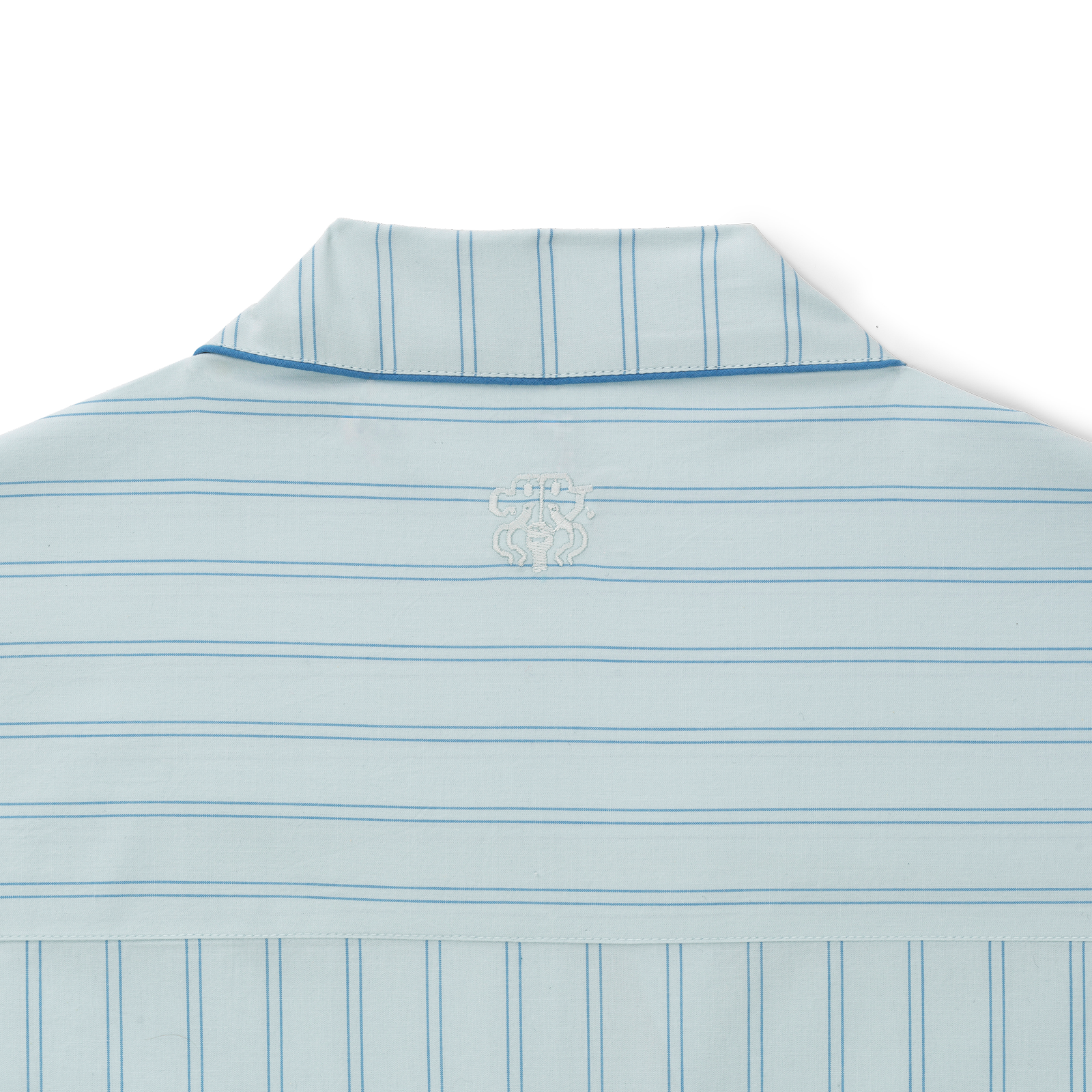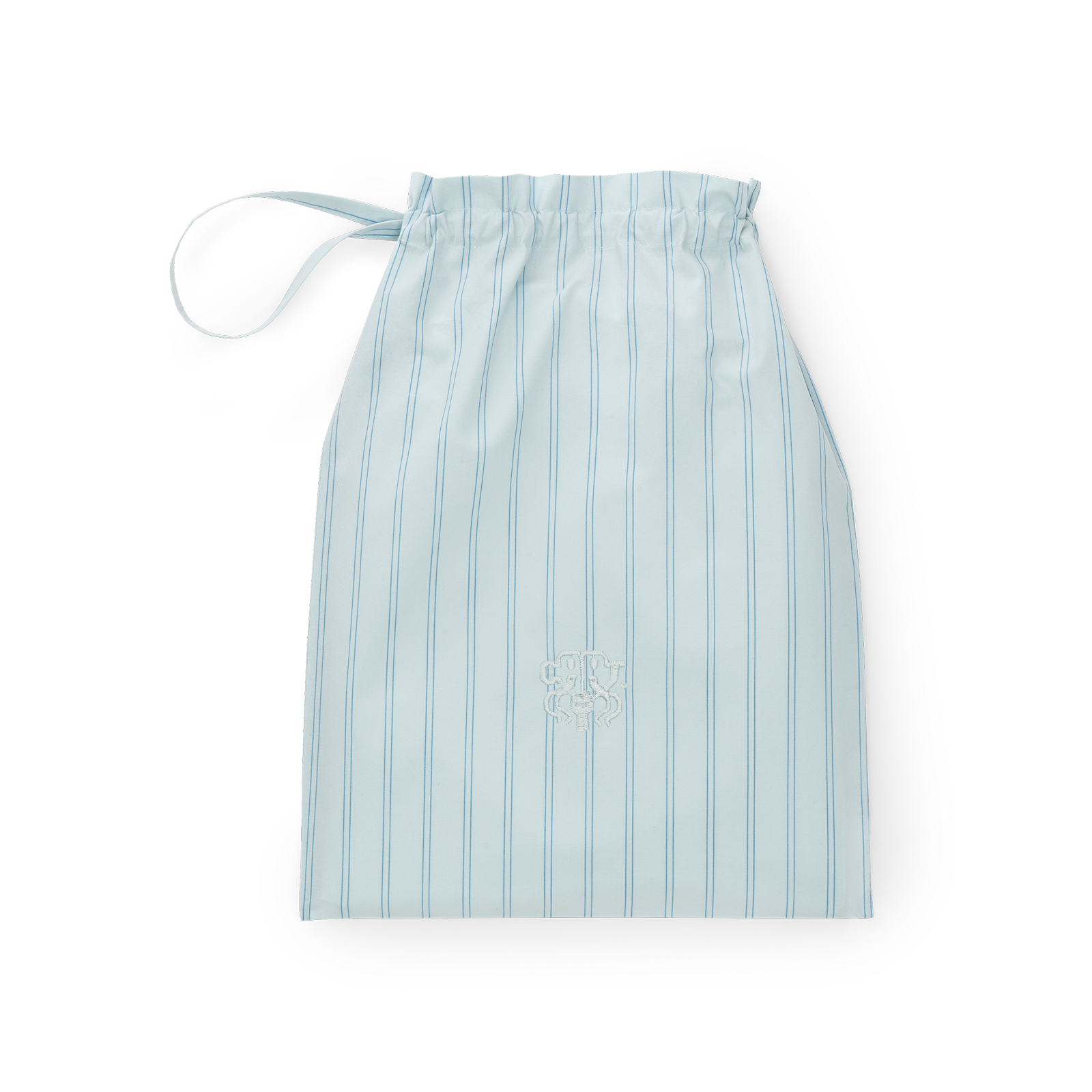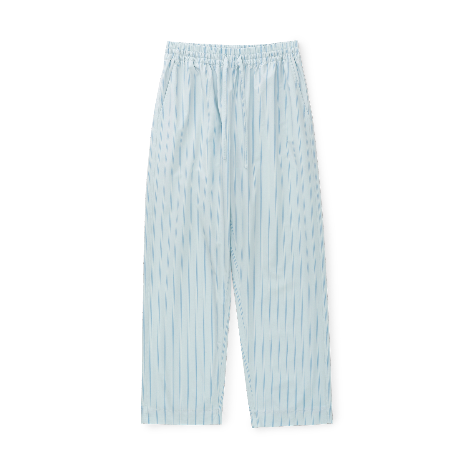 Unisex-pysjamas vevd i Supima bomull percale. Pysjamasen har en klassisk passform, elegante kantbånd og slanke nålestriper i Bright Blue mot en bakgrunn i fargen Minimal Blue – en veldig lys variant av lyseblå med et hint av aqua.