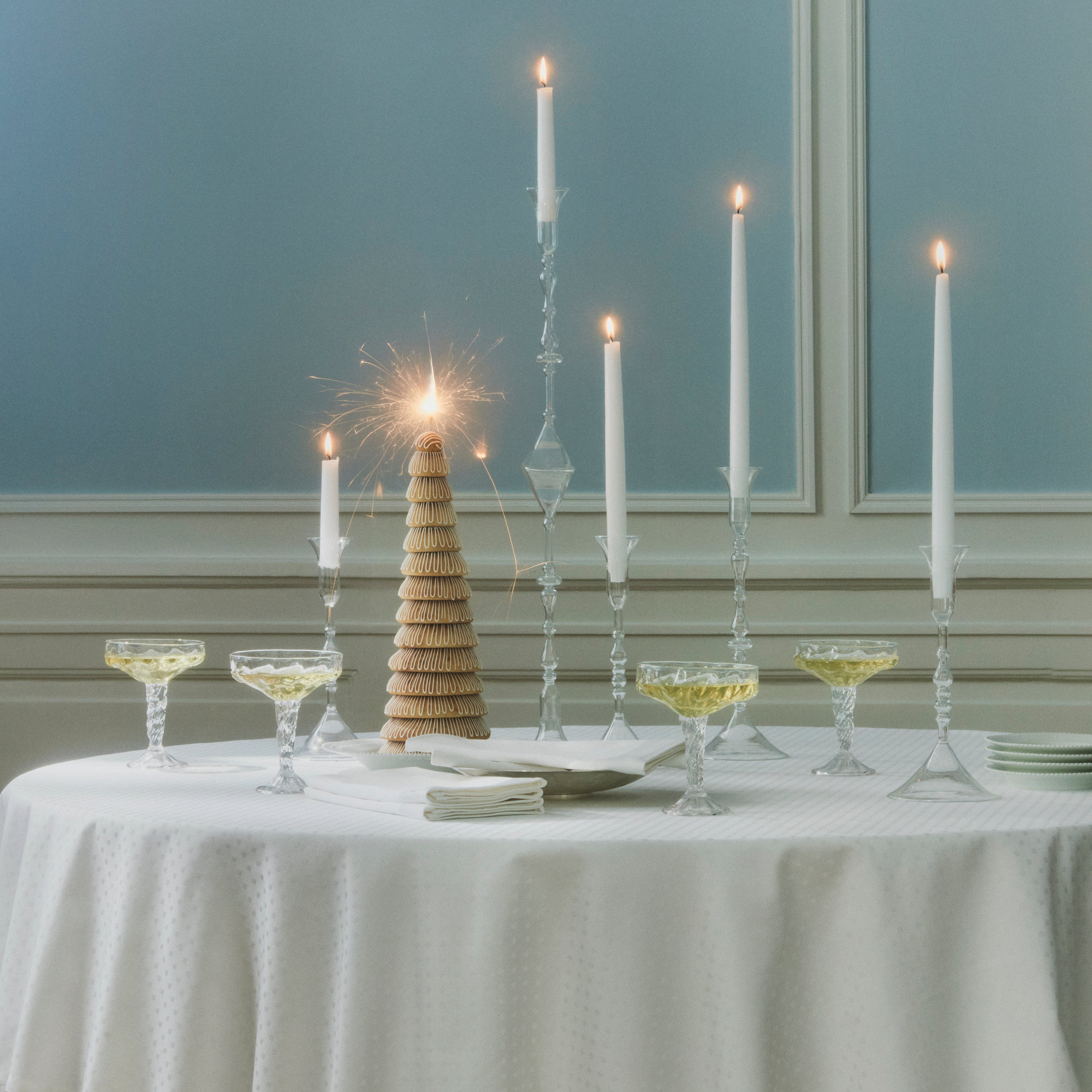 En raffinert, hvit damaskduk som inviterer vinteren til bords i form av de fineste, stiliserte snøfnugg. Tolkningen av snøfnuggenes geometri er så stram at duken også kan benyttes til andre årstider, hvor den hvite duken løfter borddekkingen og stemningen.