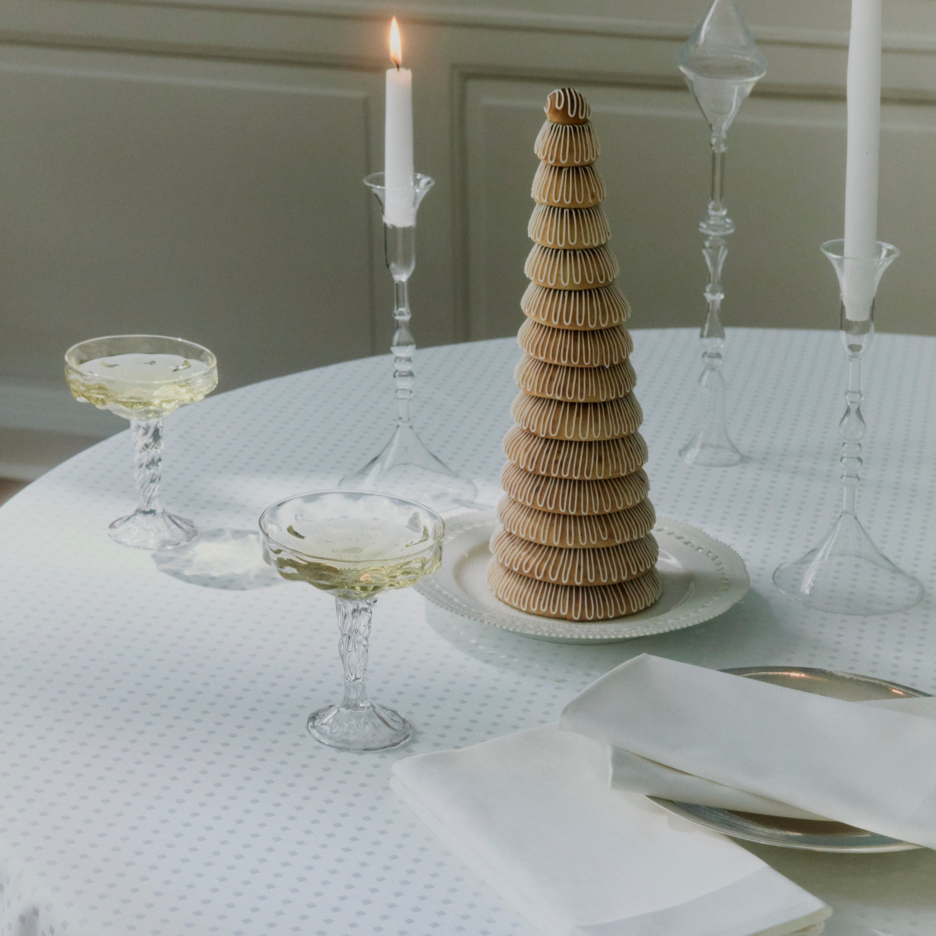 Tilbake står damaskduken som en studie i hvitt. Et blankt lerret som ikke krever en spesiell innredningsstil, men kompletteres i oppdekkingen med tilbehør ut fra humør, årstid og måltid. Matchende stoffservietter kompletterer uttrykket.