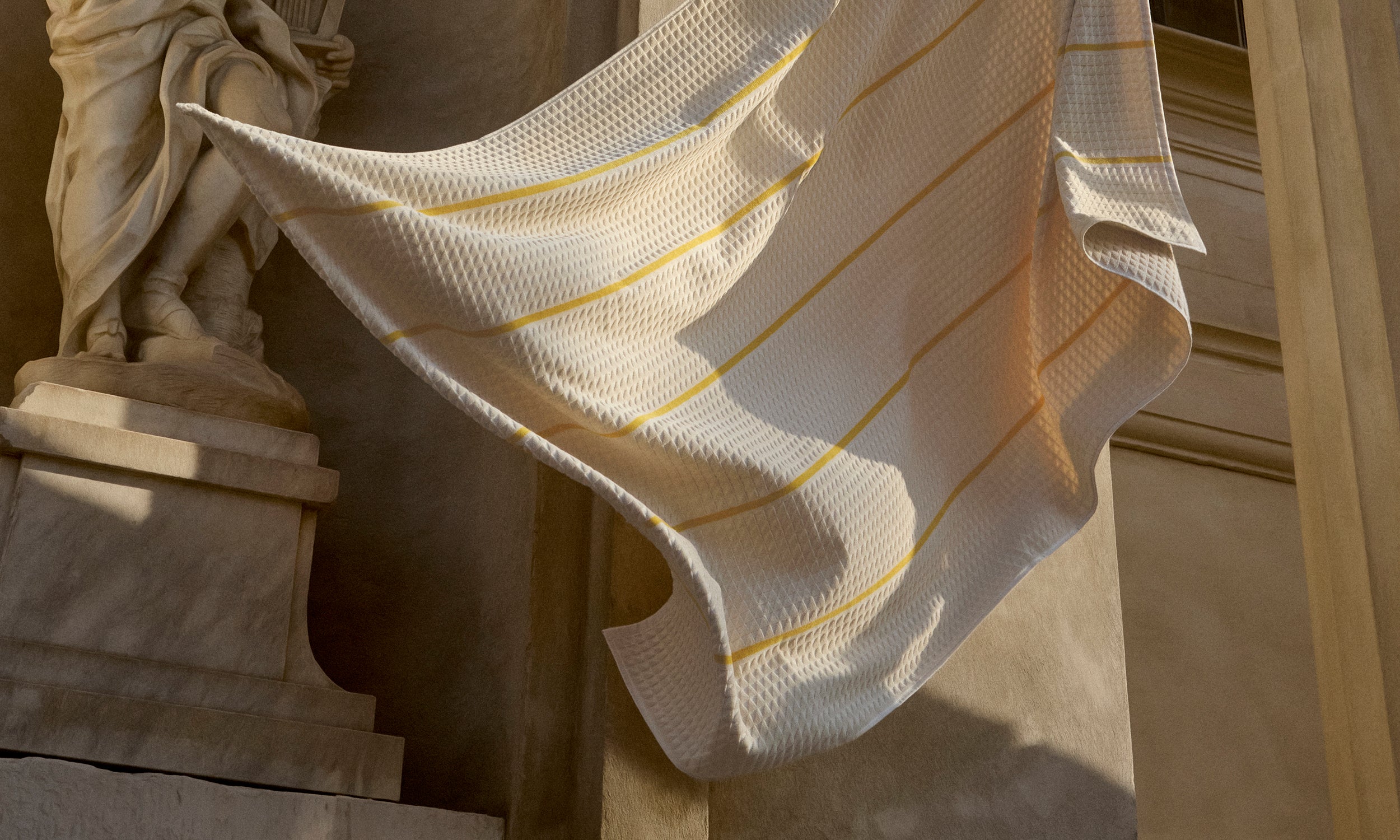 Georg Jensen Damasks elegante Special Edition-strandhåndkle er skapt med utgangspunkt i det ikoniske fasettmønsteret, der designer og vever Jette Nevers har utnyttet jacquardvevingen til å skape et elegant skyggespill i mønsterets sammenhengende trekanter. I Special Edition-strandhåndkleet fremheves den vakre geometrien i myk velourfrotté med loddrette inndelinger av solsikkegule striper.