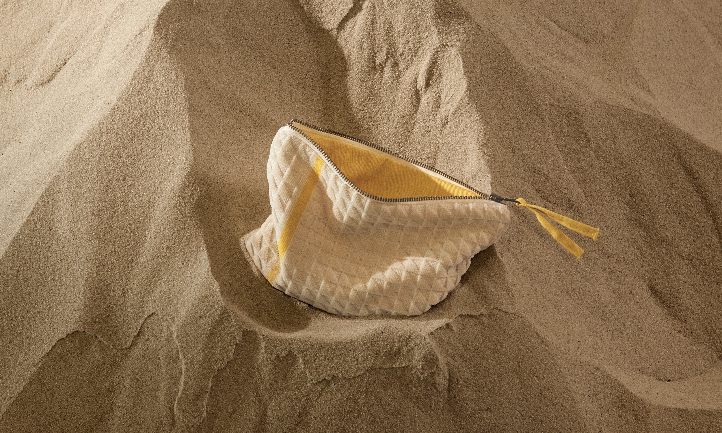Med Facet udnyttede Jette Nevers jacqardvævningen til at skabe et elegant skyggespil i mønsterets sammenhængende trekanter. I Special Edition strandhåndklædet og clutchen fremhæves den smukke geometri i blød velourfrotté med lodrette delinger af solsikkegule striber.