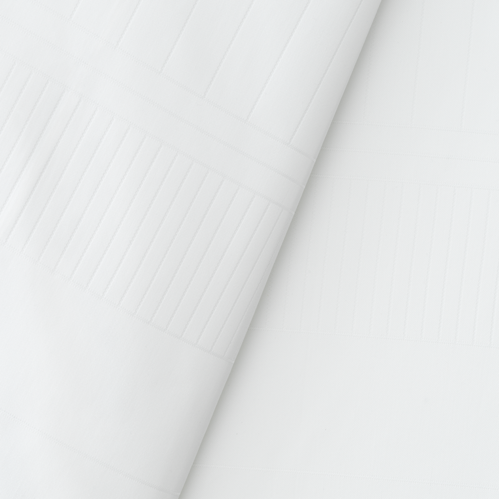 En enkel og elegant hvit damaskduk med sans for detaljer. Duken kler bordet med en dekorativ, stramt komponert estetikk som gir plass til og hyller livet omkring det veldekkede bordet.