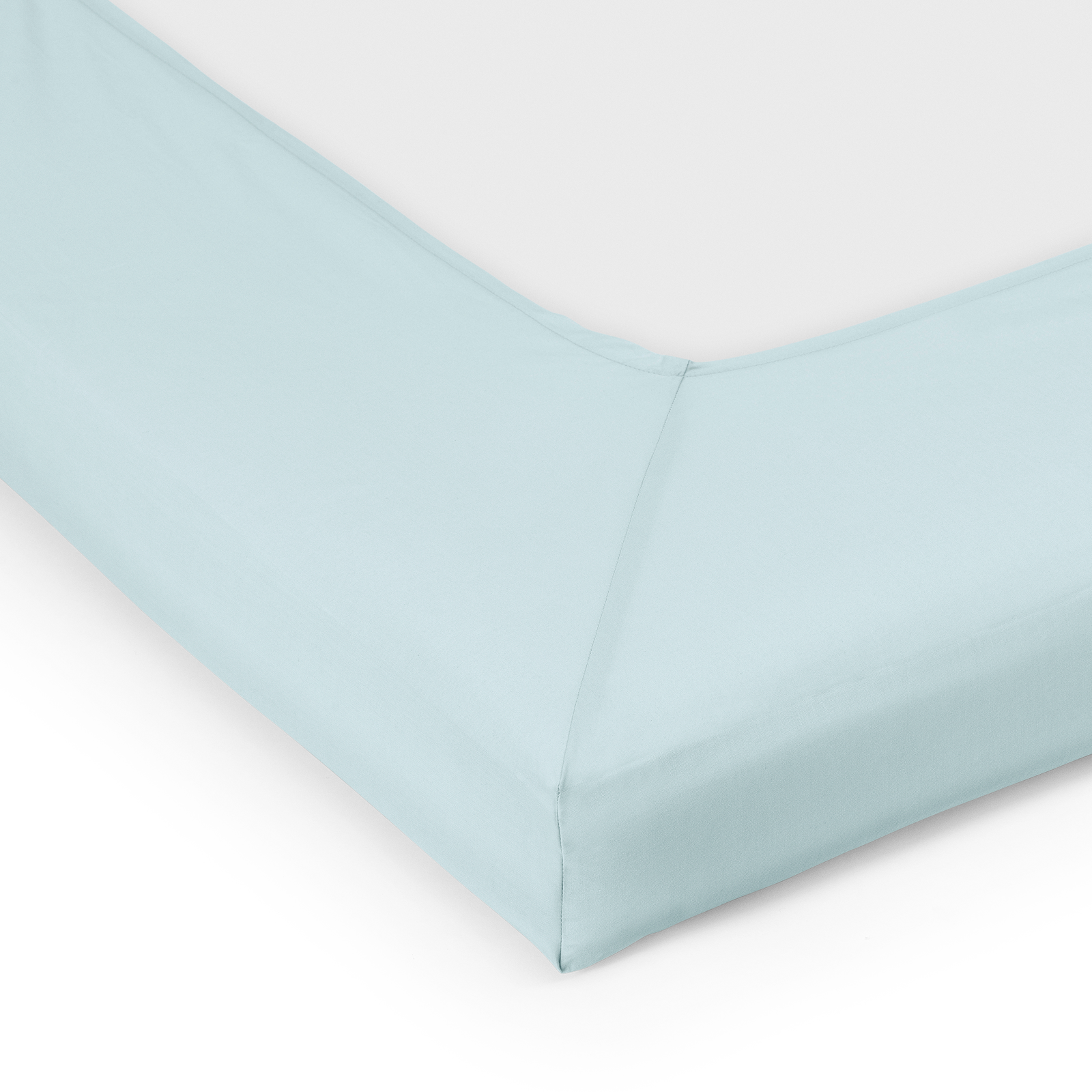 Konvoluttlakenet er fasongsydd og passer til en 8 cm høy overmadrass. Lakenet bærer Georg Jensen Damasks ikoniske logo som et diskret broderi. Minimal Blue er en blekere variant av lyseblå med et streif av akvanyanser.