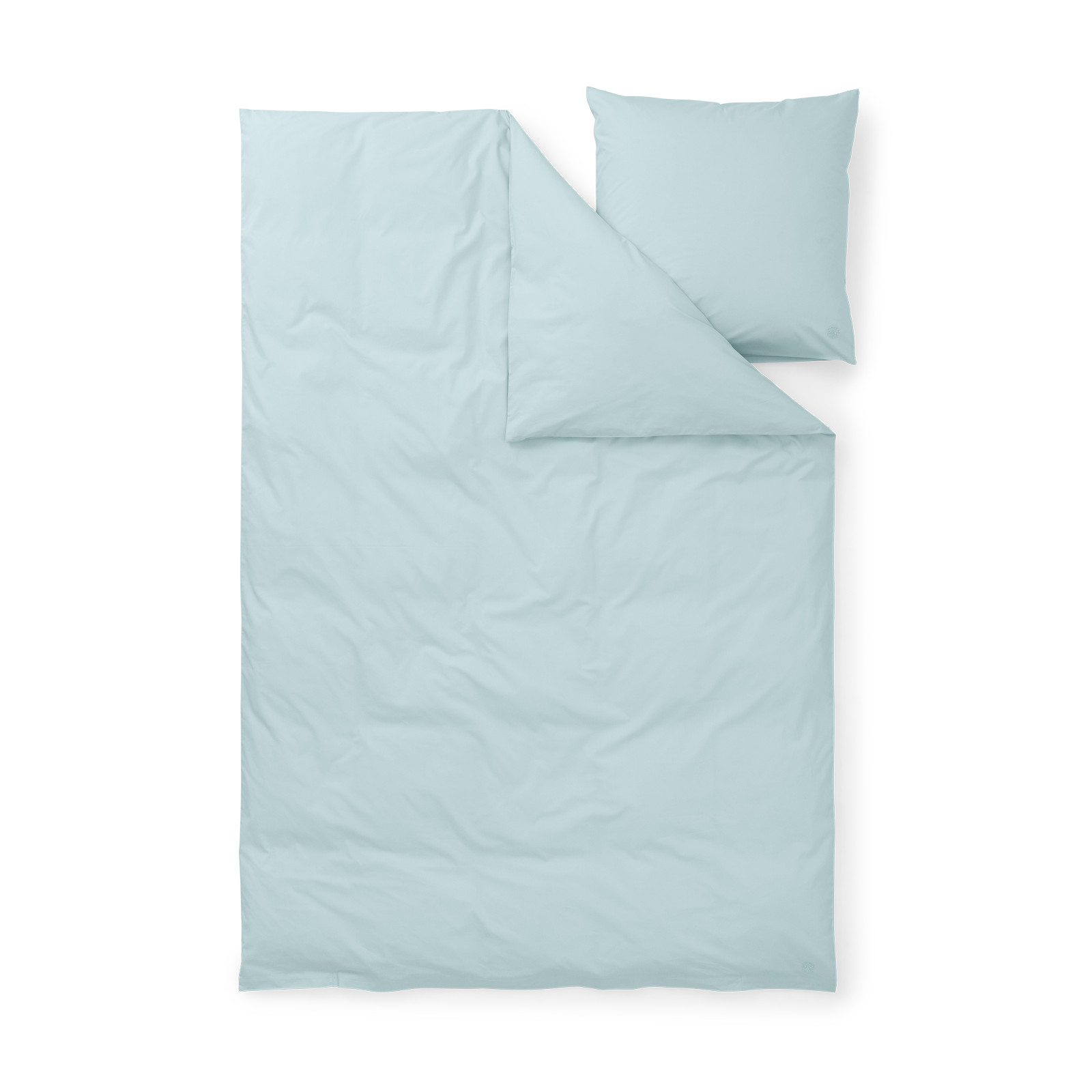 Dynetrekket lukkes med snorer og putetrekket har konvoluttlukking. Sengesettet bærer Georg Jensen Damasks ikoniske logo som et diskret broderi. Minimal Blue er en blekere variant av lyseblå med et streif av akvanyanser.