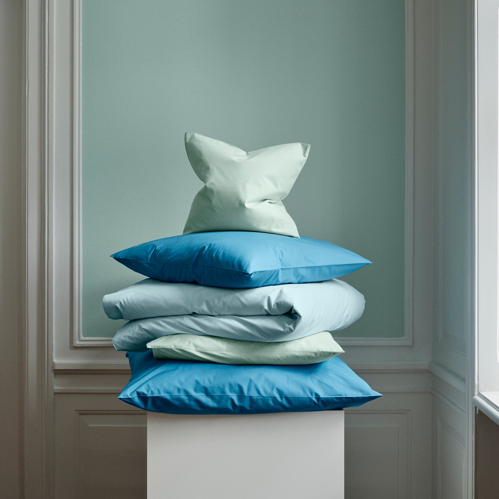 Supima Percale-serien omfatter alt fra sengegavler og puter til Dynetrekk og laken i farger som lysegrått, lysegrønt, kjølig blått og varme jordfarger. De lange bomullsfibrene gir sengetøyet en spesielt vakker og svært jevn fargetone.