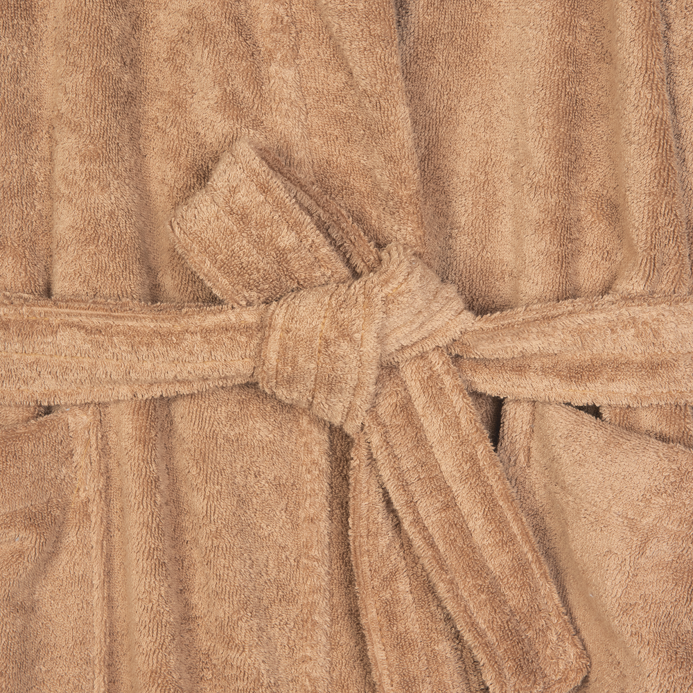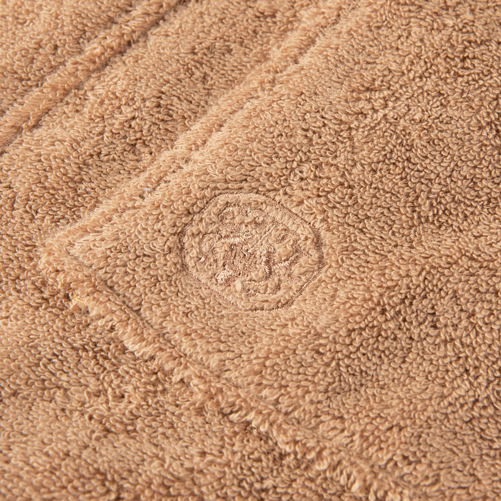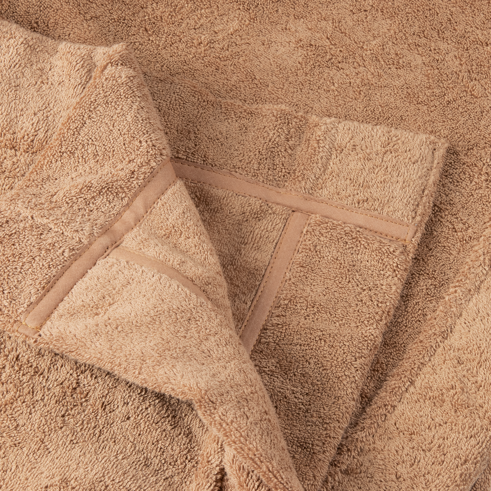 Badekåpen har to store lommer foran med brodert logo og en lengde som går til under kneet. Den har bomullskantebånd på de innvendige sømmene – en eksklusiv detalj som skaper ekstra komfort.