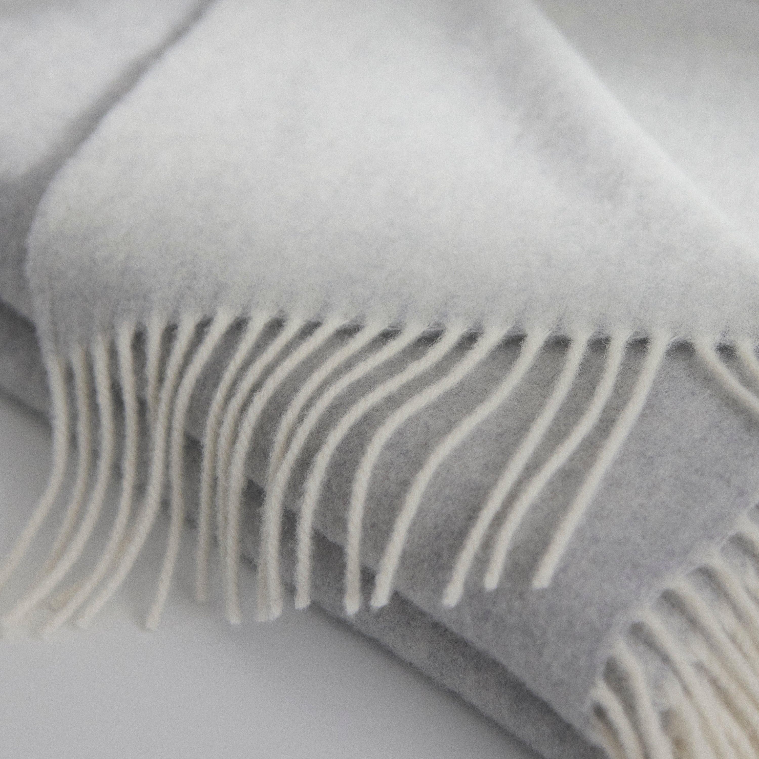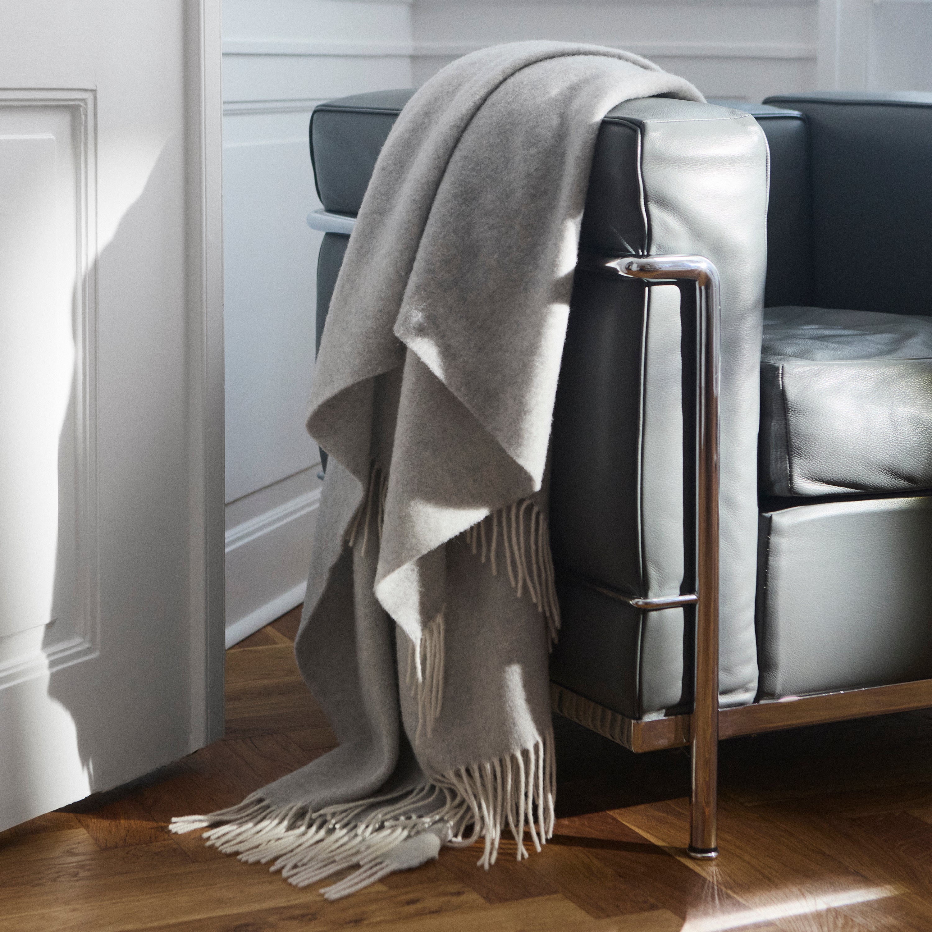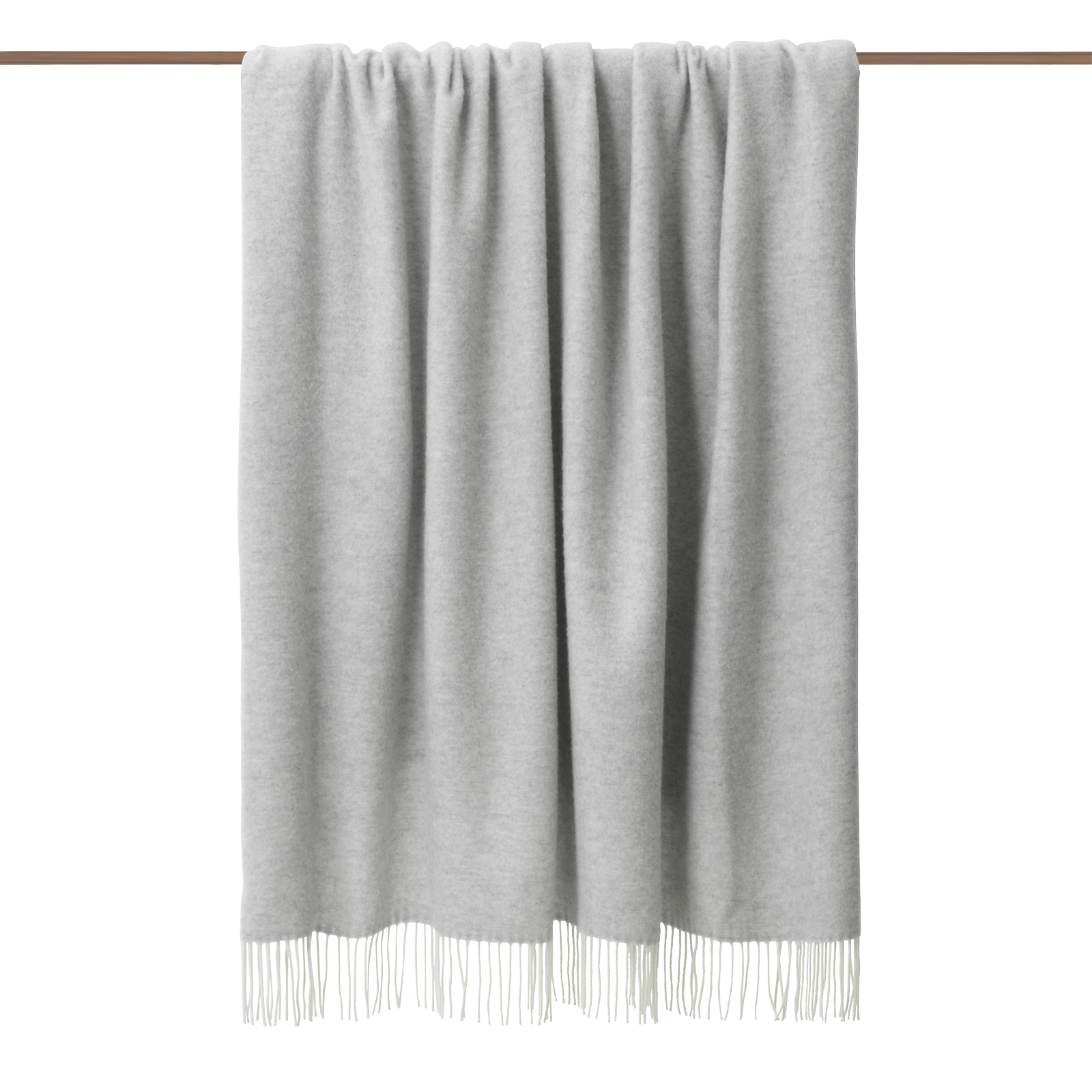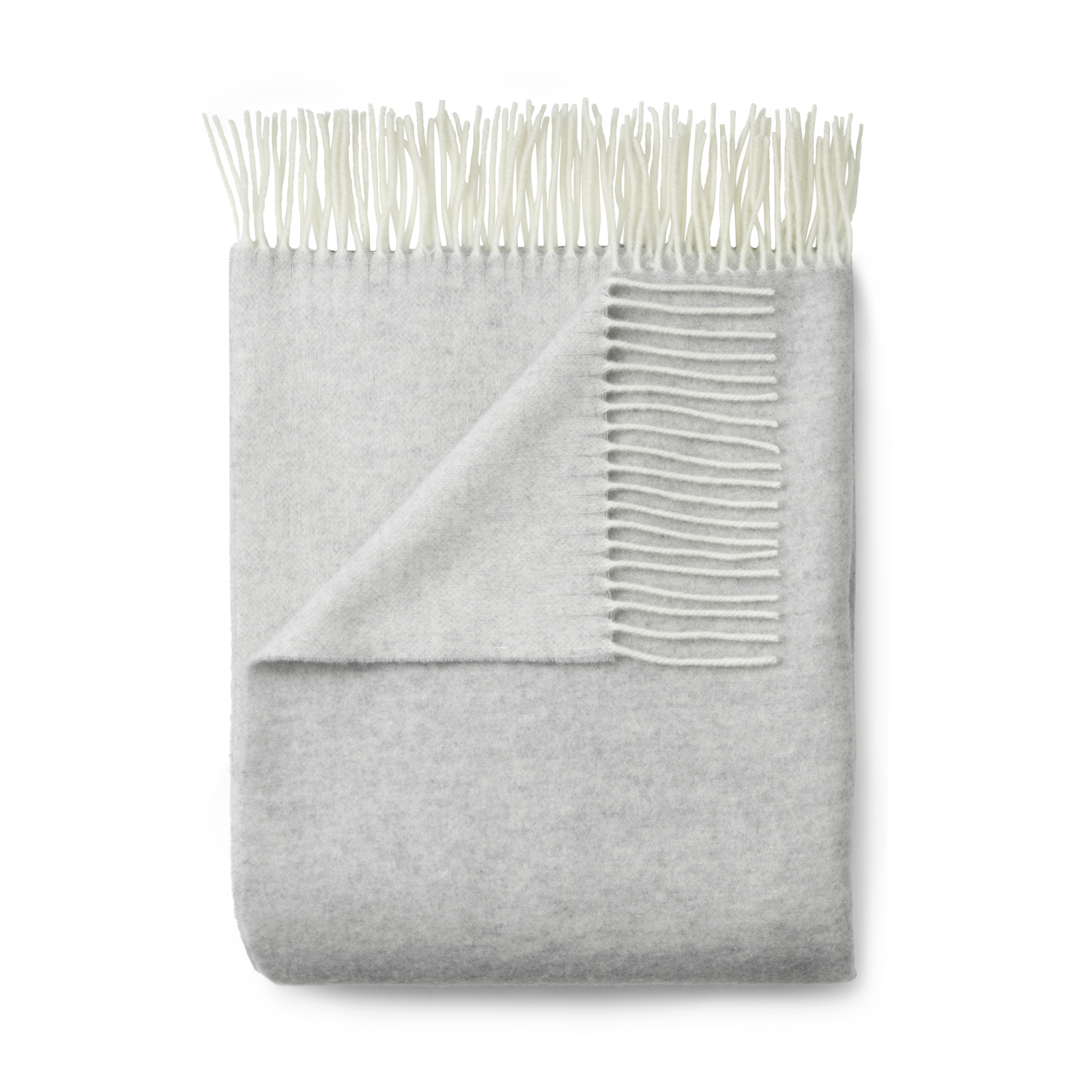 Union-pleddets fine kvalitet i merinoull og kasjmir gir en vakker overflate og en helt spesiell mykhet. Den diskrete fargeforskjellen i lysegrå toner på for- og baksiden gir pleddet et helt enkelt uttrykk.
